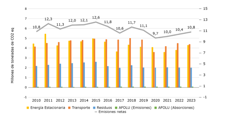 Para el año 2023, Bogotá emitió 10.758.818 toneladas de CO2 equivalente. (sin incluir el sector de Agricultura, Silvicultura y Otros Usos del Suelo-AFOLU).