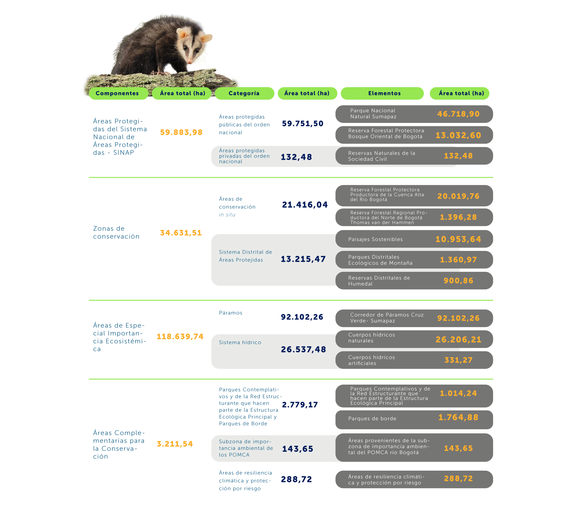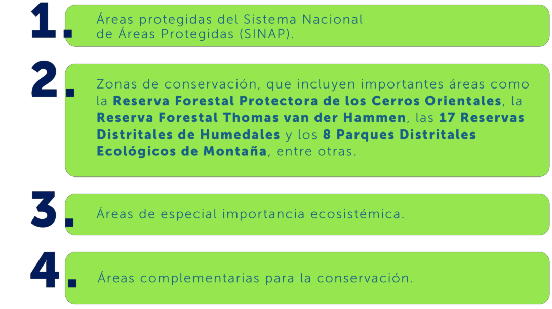 Componentes de la Estructura Ecológica Principal: Áreas Protegidas del Sistema Nacional de Áreas Protegidas (SINAP), Zonas de Conservación, Áreas de Especial Importancia Ecosistémica y Áreas Complementarias para la Conservación.