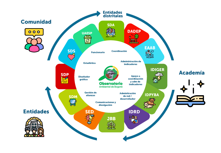 El Observatorio Ambiental de Bogotá -OAB es administrado desde la Oficina Asesora de Planeación de la Secretaría Distrital de Ambiente por dos equipos: